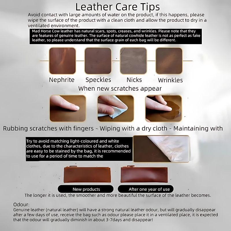 Made from Crazy Horse leather. Crazy Horse leather absorbs oils from your hands, developing a unique glossy finish that enhances its character. Scratches change the leather's color, giving it a rugged and mature look, making each piece truly one-of-a-kind.