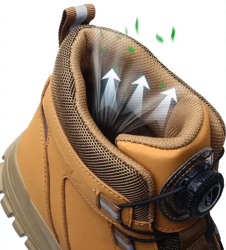 Our work shoes feature a unique button design that allows you to adjust the tightness of the shoe by simply turning the button clockwise. When you want to take off your shoes, turn the button counterclockwise to loosen the laces. Never worry about loose laces again.