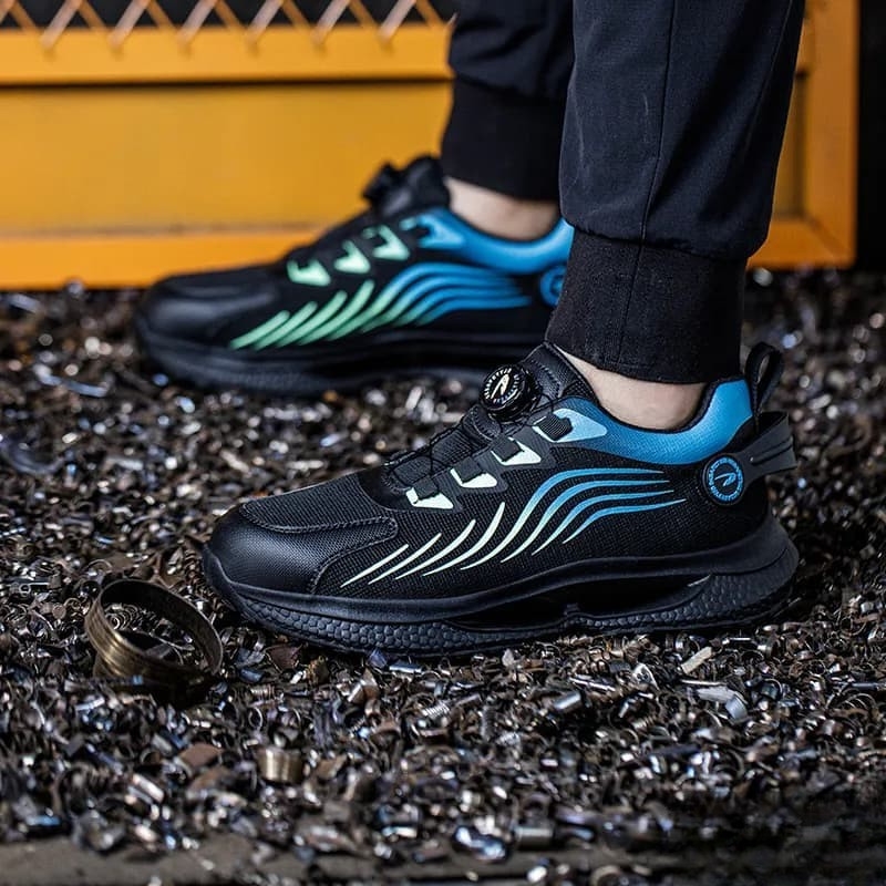 Our work shoes feature a unique button design that allows you to adjust the tightness of the shoe by simply turning the button clockwise. When you want to take off your shoes, turn the button counterclockwise to loosen the laces. Never worry about loose laces again.