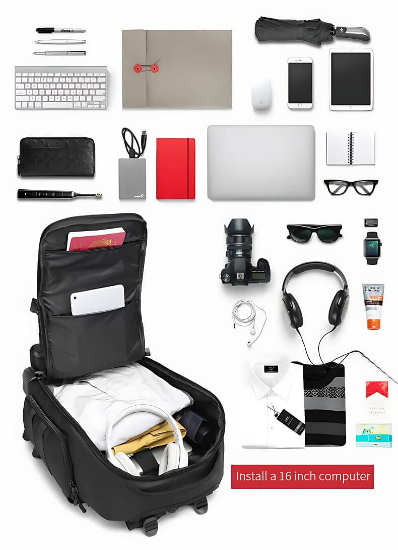 Designed to fit everything from a 16-inch laptop to your daily necessities like gadgets, clothes, and accessories, it combines style with functionality effortlessly. With dedicated compartments and intuitive design, you'll never have to leave anything behind.
